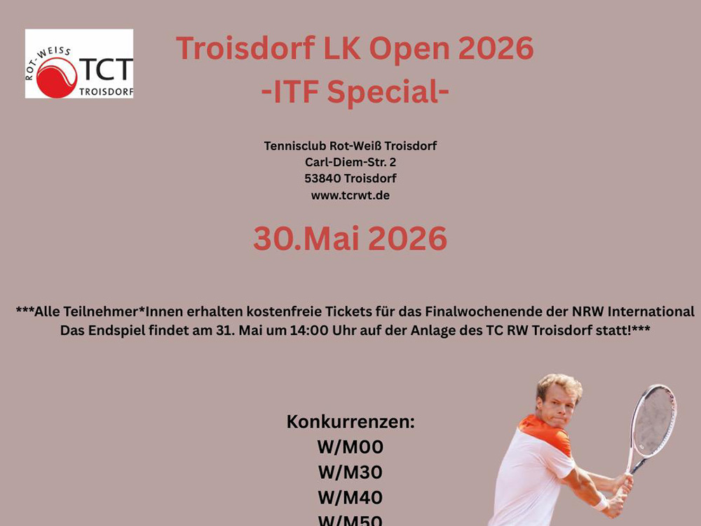 Troisdorf LK Open 2026 Am 30. Mai 2026 findet auf unserer Anlage ein LK-Turnier für alle Altersklassen (offene Klasse bis W/M 60) statt. Weitere Informationen gibt es hier.